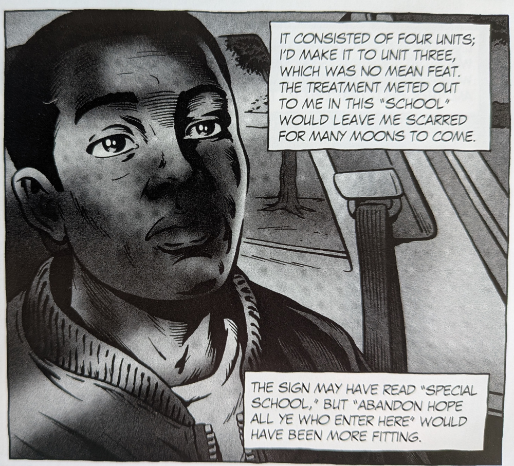The first of those namechecking books was Black, an autobiographical graphic novel. This being the 70s and 80s, there’s a lot of darkness around, illustrating the point several of the month’s authors make about the assiciation of blackness with negativity in European/Anglo-Saxon culture. Visually, Smith takes the opportunity to show the Black skin and literal and moral darkness of the environment in a thought-provoking way: